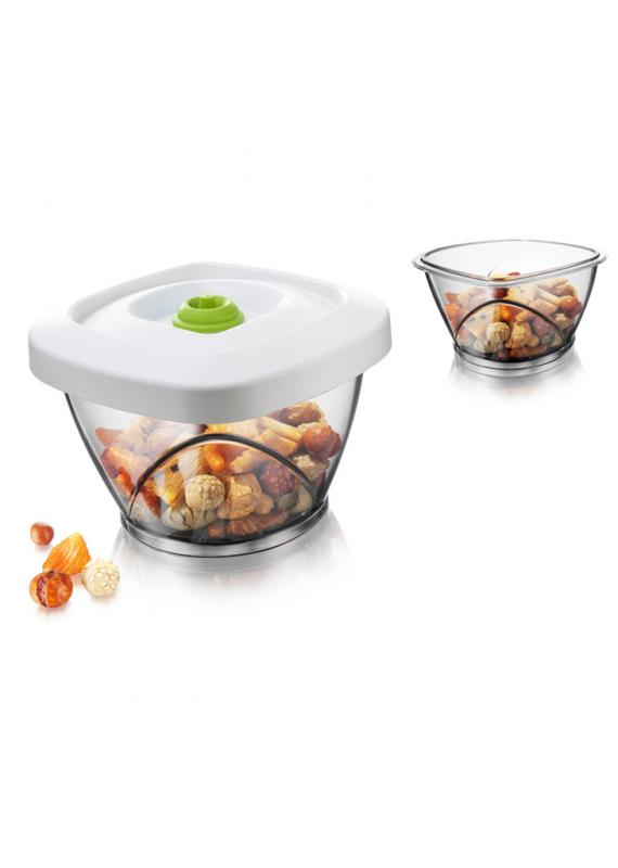 Multor alimente le este deteriorata structura in momentul in care sunt expuse la aer, ceea ce duce la afectarea gustului. Recipientul pentru depozitare de la Vacu Vin este ideal pentru produsele sensibile, cum ar fi biscuitii, chipsurile, nucile, cerealele, cafeaua sau ceaiul. Pompa de vacuumat extrage aerul din cutia de vidare, creand conditii optime pentru depozitare. Recipientul are o capacitate de stocare de 0,65 L. Pompa pentru vacuumat nu este inclusa, insa o puteti gasi aici.
