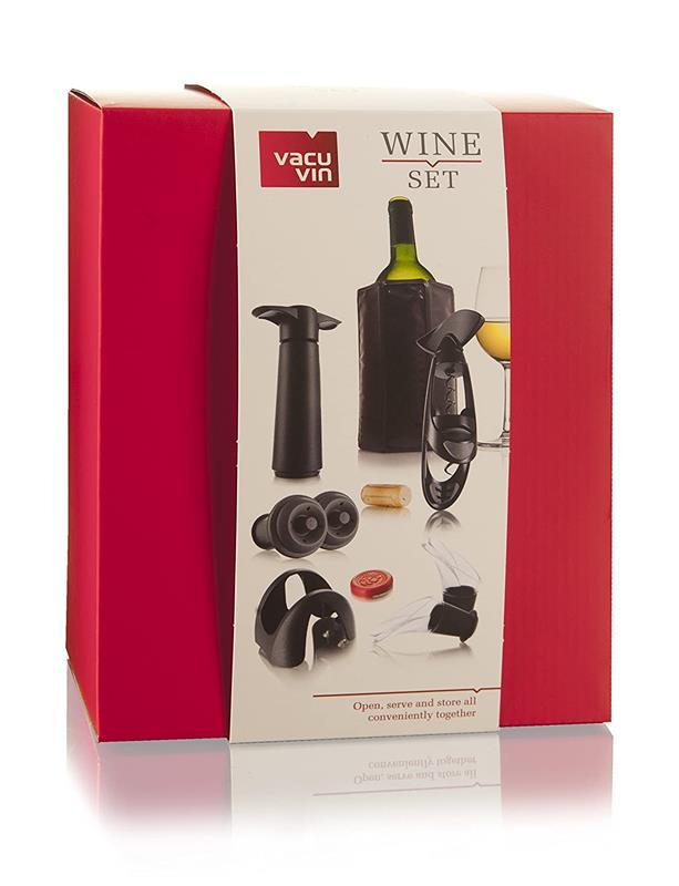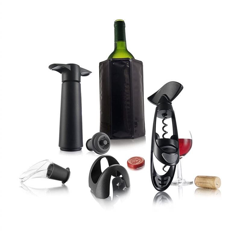 Acest set de accesorii este un cadou deosebit pentru bautorii de vin experimentati. Componentele setului sunt concepute pentru a va oferi o experienta noua a degustarii vinului. Accesoriile acopera intregul proces de servire, incepand cu racirea sticlei, urmand deschiderea acesteia si terminand cu procesul de extragere a aerului din sticla in care a mai ramas vin. Setul include: -desfacator Twister -taietor de capison -racitor flexibil cu gel -2 antipicuratoare -pompa vacuumare -set 2 dopuri vacuumare din cauciuc.