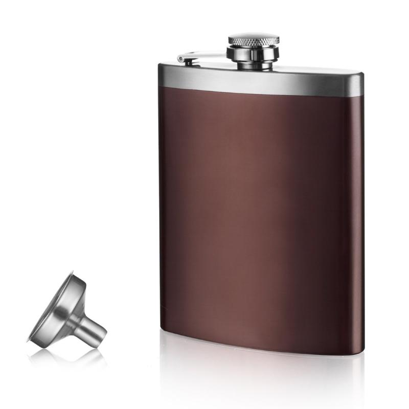 Cu ajutorul acestei sticle de 240 ml capacitate, puteti avea cu dvs. orice bautura. Datorita formei curbate si dimensiunilor sale, sticla poate fi tinuta in buzunar. Are inclusa o palnie pentru umplere usoara. Dimensiuni (LxlXh): 92 x 25 x 137 mm. Greutate: 140 gr. Materiale din care este confectionata: otel inoxidabil, plastic, silicon.